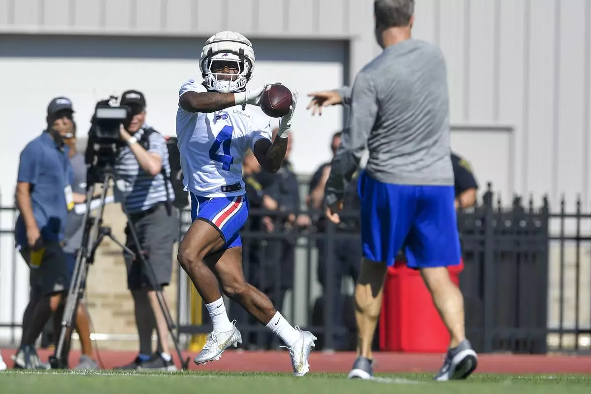 Buffalo Bills running back James Cook (4) catches a ball during practice at the team’s NFL football training camp, Wednesday, July 23, 2025, in Pittsford, N.Y. (AP Photo/Adrian Kraus)
