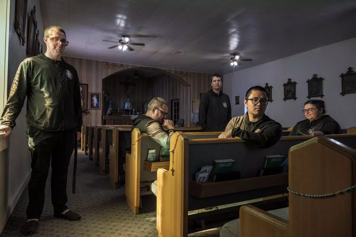 League of the Blessed Sacrament members Edward Seeley, from left to right, Eric Faris, Giovanni Vizcarra, Anthony Ribaya and Lisa Hezmalhalch, gather inside the San Rafael parish church in Concho, Ariz., Saturday, June 21, 2025. Bishop James S. Wall has ordered the lay group of young Catholics to leave parish housing and stop leading liturgy and teaching in the region’s Catholic school. (AP Photo/Roberto E. Rosales)