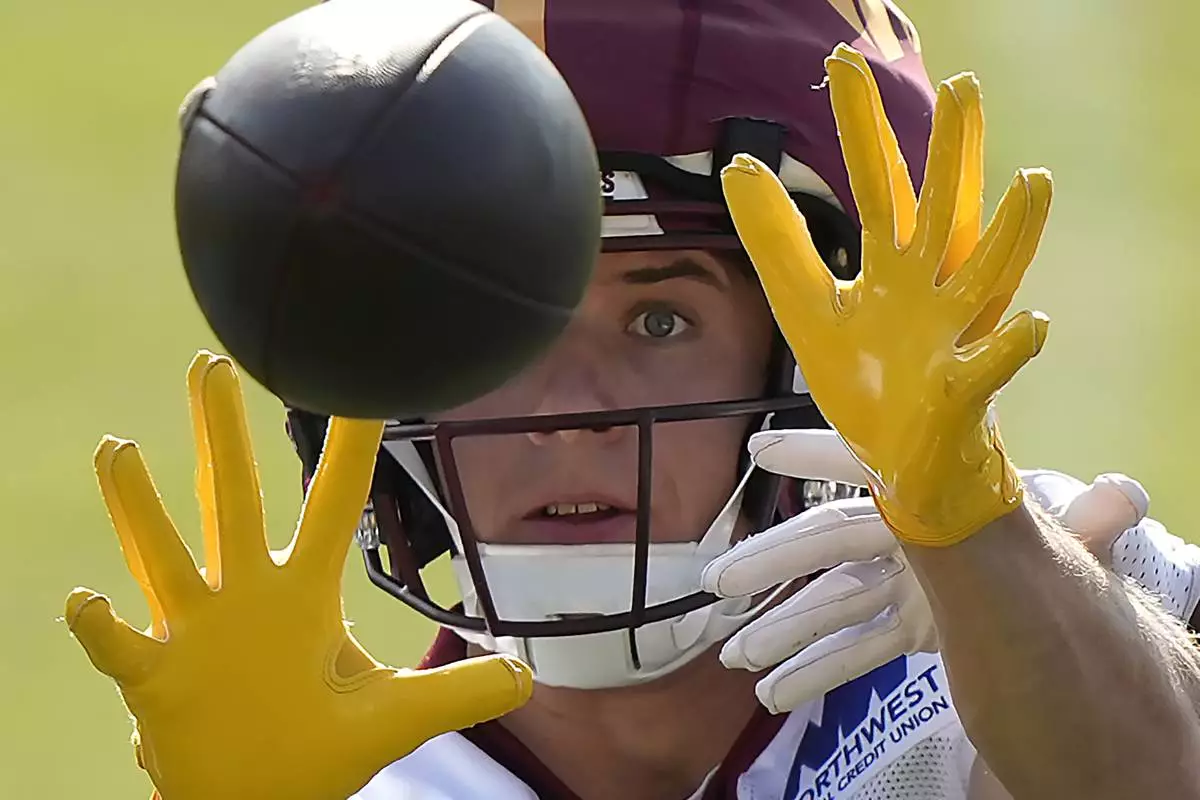 Washington Commanders wide receiver Luke McCaffrey (11) catches a ball during practice at the team's NFL football training camp, Thursday, July 24, 2025, in Ashburn, Va. (AP Photo/Mark Schiefelbein)