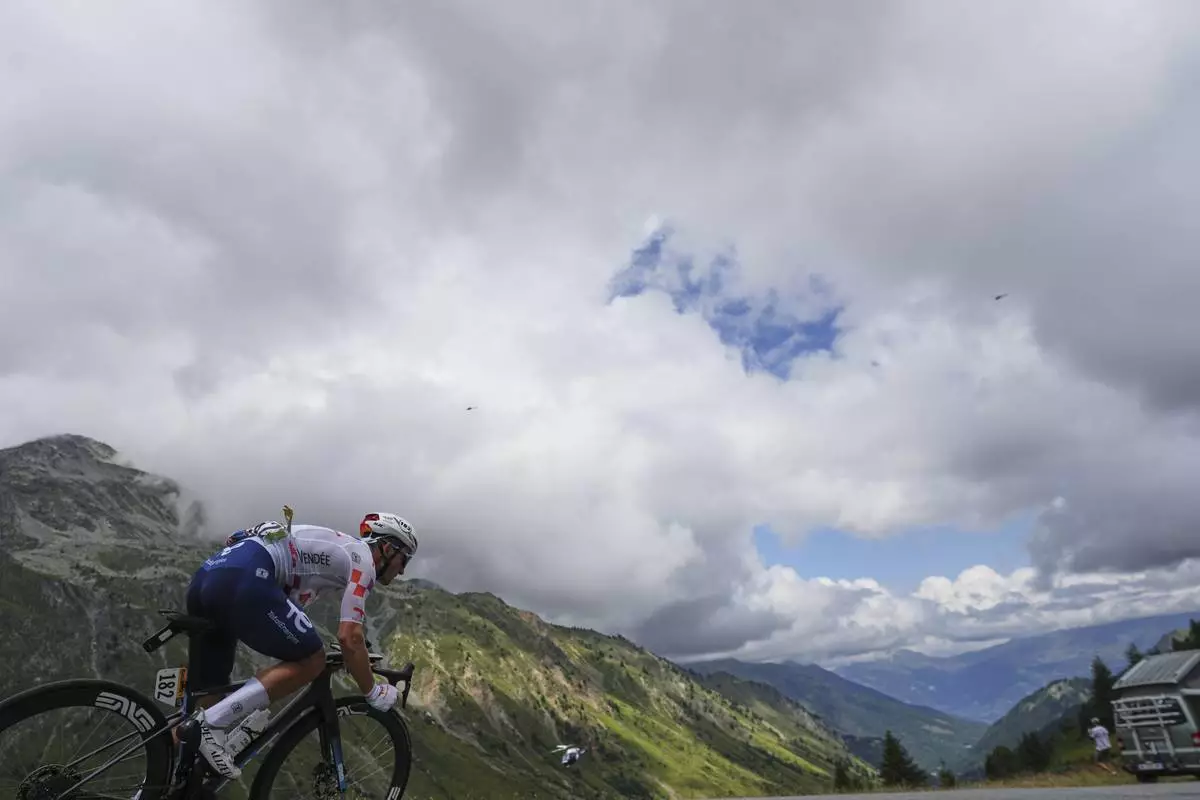 France's Mathieu Burgaudeau speeds down Col du Glandon during the eighteenth stage of the Tour de France cycling race over 171.5 kilometers (106.6 miles) with start in Vif and finish in Courchevel Col de la Loze, France, Thursday, July 24, 2025. (AP Photo/Thibault Camus)