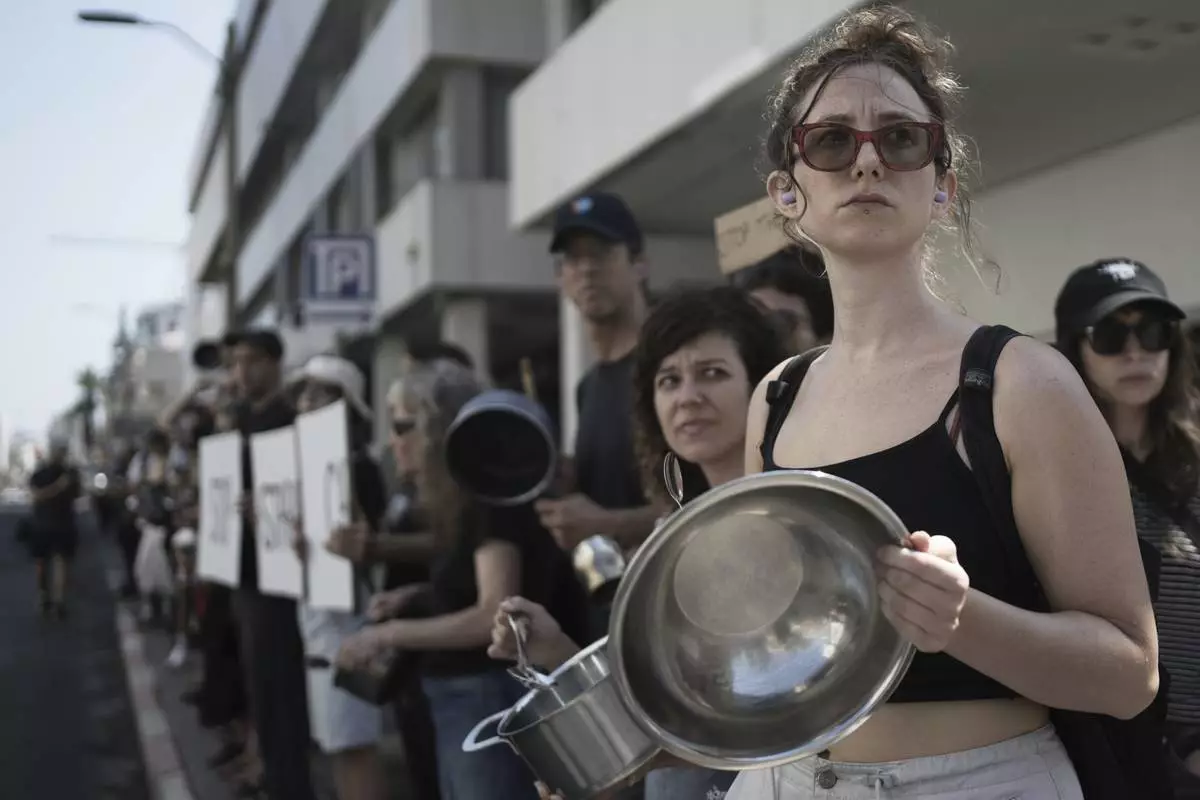 Israeli activists bang pots and pans to protest the starvation of Palestinian civilians in the Gaza Strip, outside of the U.S. Embassy branch office in Tel Aviv, Israel, Thursday, July 24, 2025. (AP Photo/Maya Alleruzzo)