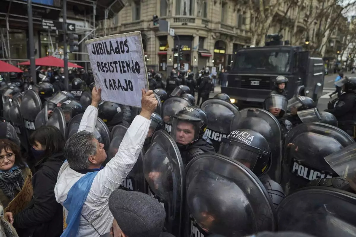 A demonstrator holds up a sign with a message that reads in Spanish: "Pensioners resisting," in front of a police cordon during a weekly protest demanding better pensions for retirees in Buenos Aires, Argentina, Wednesday, July 23, 2025. (AP Photo/Victor R. Caivano)