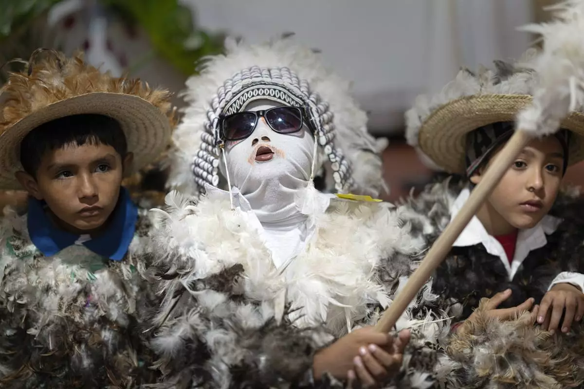 Children dressed in feather costumes attend a Mass celebrating Saint Francisco Solano, in Emboscada, Paraguay, Thursday, July 24, 2025. Hundreds of Catholic parishioners in Paraguay don bird-like costumes and parade down the streets to honor the 16th century saint said to possess miraculous powers. (AP Photo/Jorge Saenz)