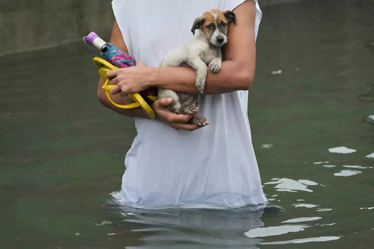 A puppy is carried by a man after being rescued from a flooded home as Typhoon Co-may intensified seasonal monsoon rains at Malabon city, Philippines on Friday, July 25, 2025. (AP Photo/Aaron Favila)