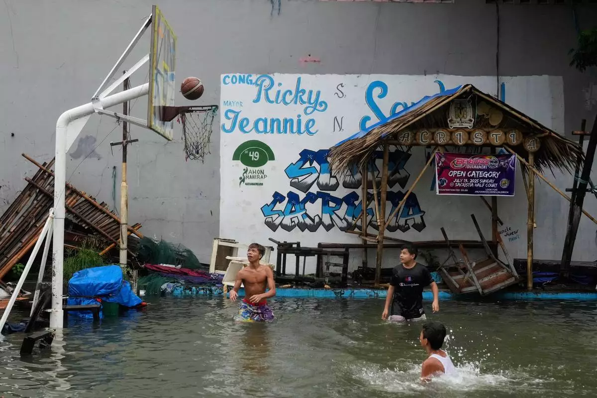 Boys play basketball at a flooded court as Typhoon Co-may intensified seasonal monsoon rains at Malabon city, Philippines on Friday, July 25, 2025. (AP Photo/Aaron Favila)
