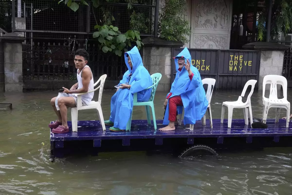 Residents use poles as they ride an improvised float along a flooded road as Typhoon Co-may intensified seasonal monsoon rains at Malabon city, Philippines on Friday, July 25, 2025. (AP Photo/Aaron Favila)