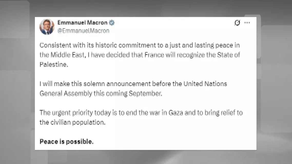 French President Emmanuel Macron announced on Thursday that France will officially recognize the State of Palestine during the upcoming 80th session of the United Nations General Assembly (UNGA 80) in September.