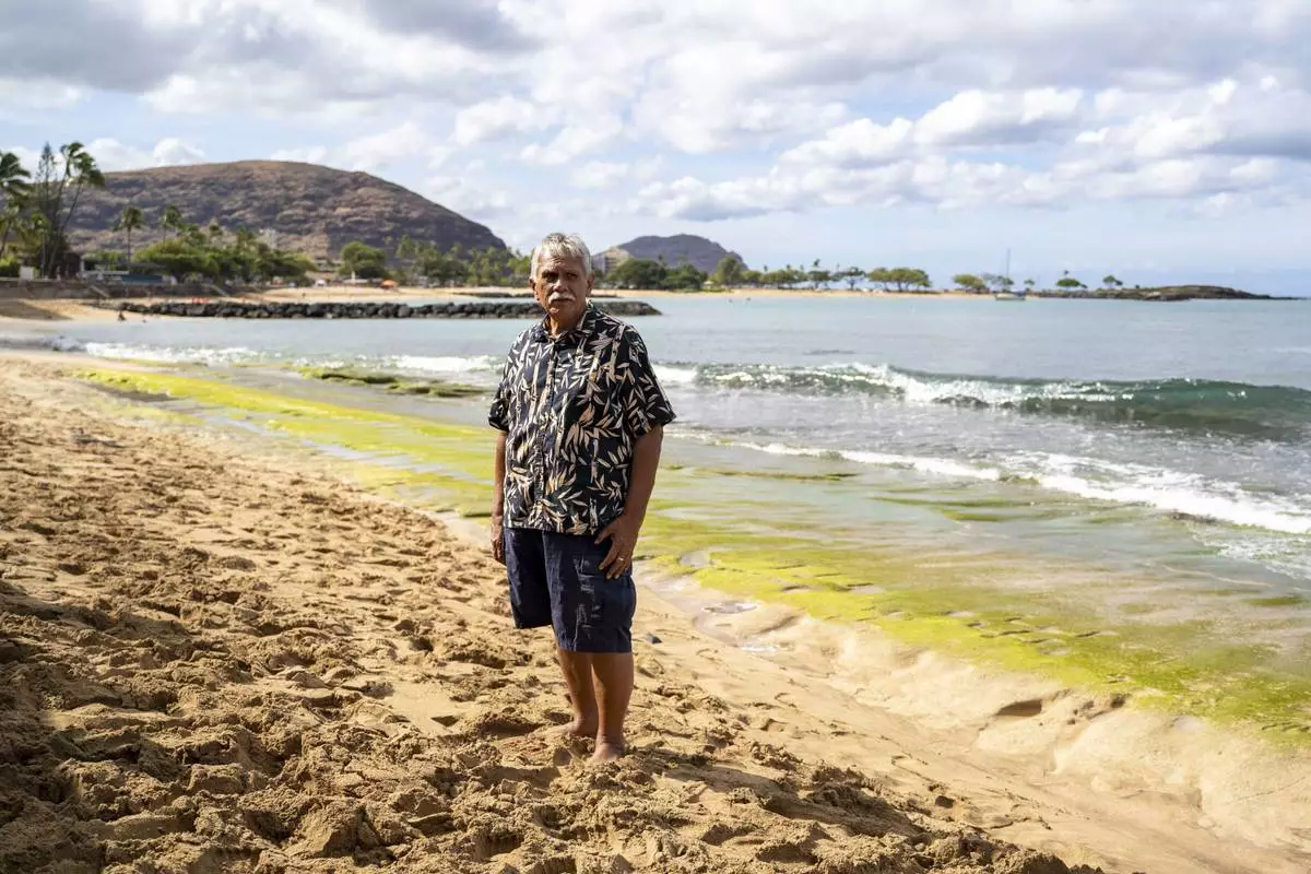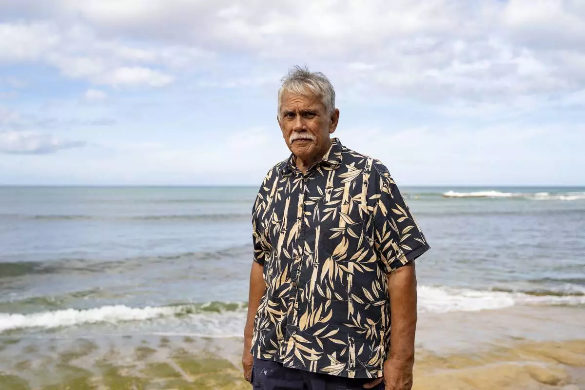 Cultural practitioner Glen Kila poses for a portrait near the shoreline where ancient petroglyphs at Pokai Bay, July 22, 2025, in Waianae, Hawaii. (AP Photo/Mengshin Lin)