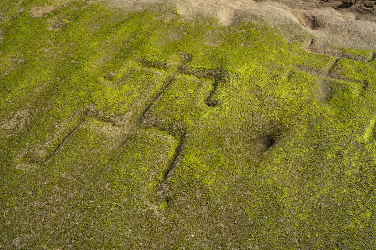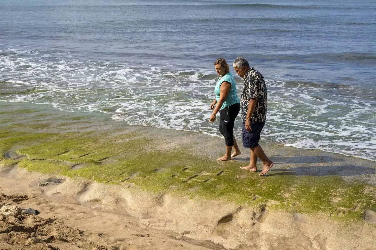 The petroglyphs are easy to spot during low tide when gentle waves ebb and flow over slippery, neon-green algae growing on a stretch of sandstone. This is the first time the entire panel of petroglyphs are visible since they were first spotted nine years ago by two guests staying at a bayside U.S. Army recreation center in Waianae, about an hour’s drive from Honolulu.