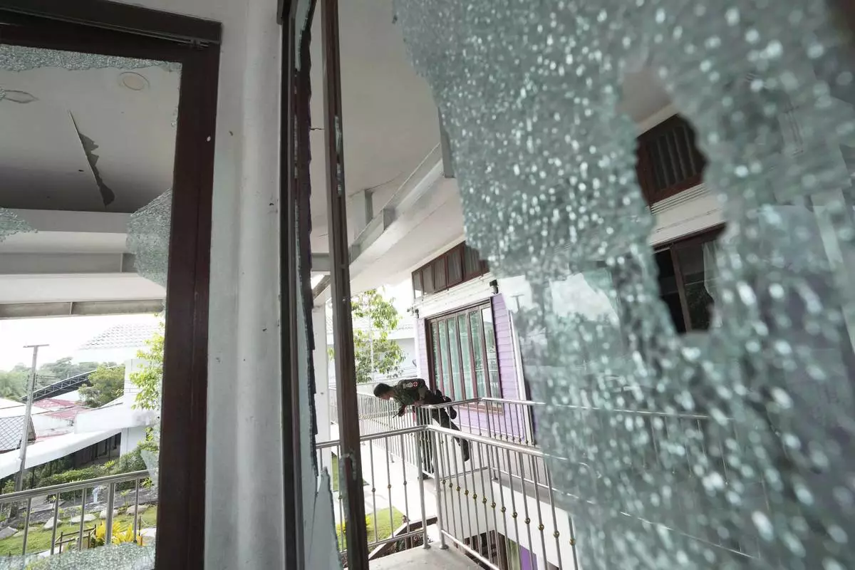A Thai soldier stands at the Phanom Dong Rak hospital damaged after Cambodia fired artillery shells in Surin Province, Thailand, Friday, July 25, 2025. (AP Photo/Sakchai Lalit)