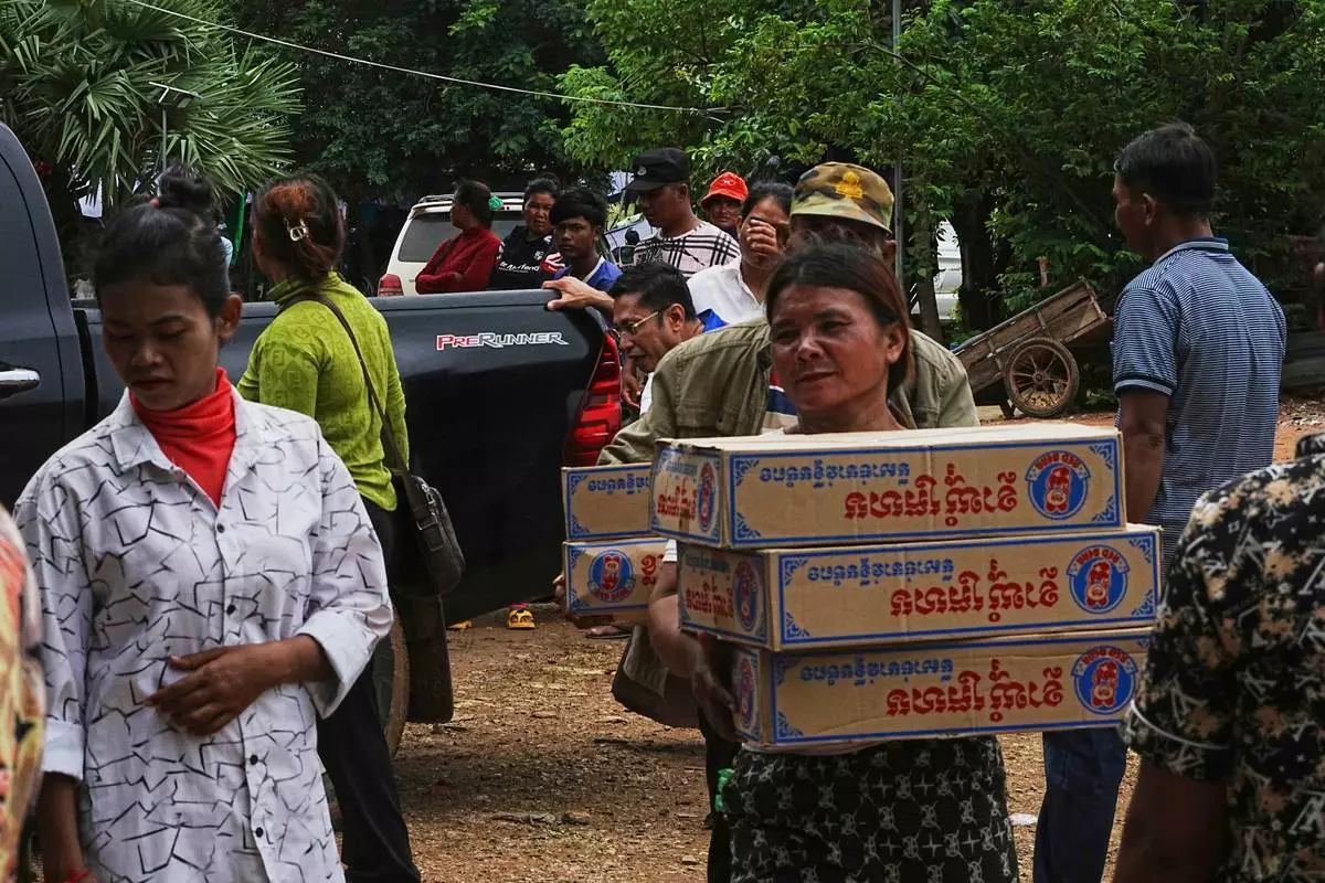Local villagers carry boxes of Khmer noodle after they received the donated by a charity in Wat Phnom Kamboar, Oddar Meanchey province, Cambodia, Sunday, July 27, 2025, amid a deadly border dispute between Thailand and Cambodia. (AP Photo/Heng Sinith)