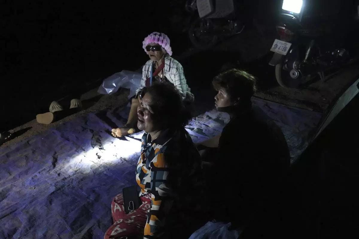 A local villager weeps as she donates her personal belongings for the frontline army force at a sidewalk in Srey Snam district in Siem Reap province, Cambodia, Saturday, July 26, 2025. (AP Photo/Heng Sinith)