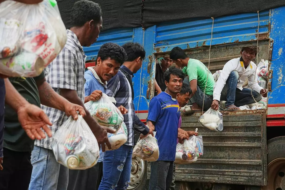 Local villagers help unloading supplies donated by a charity for refugees from a truck, as they take refuge in Wat Phnom Kamboar, Oddar Meanchey province, Cambodia, Sunday, July 27, 2025, amid the fighting between Thailand and Cambodia. (AP Photo/Heng Sinith)