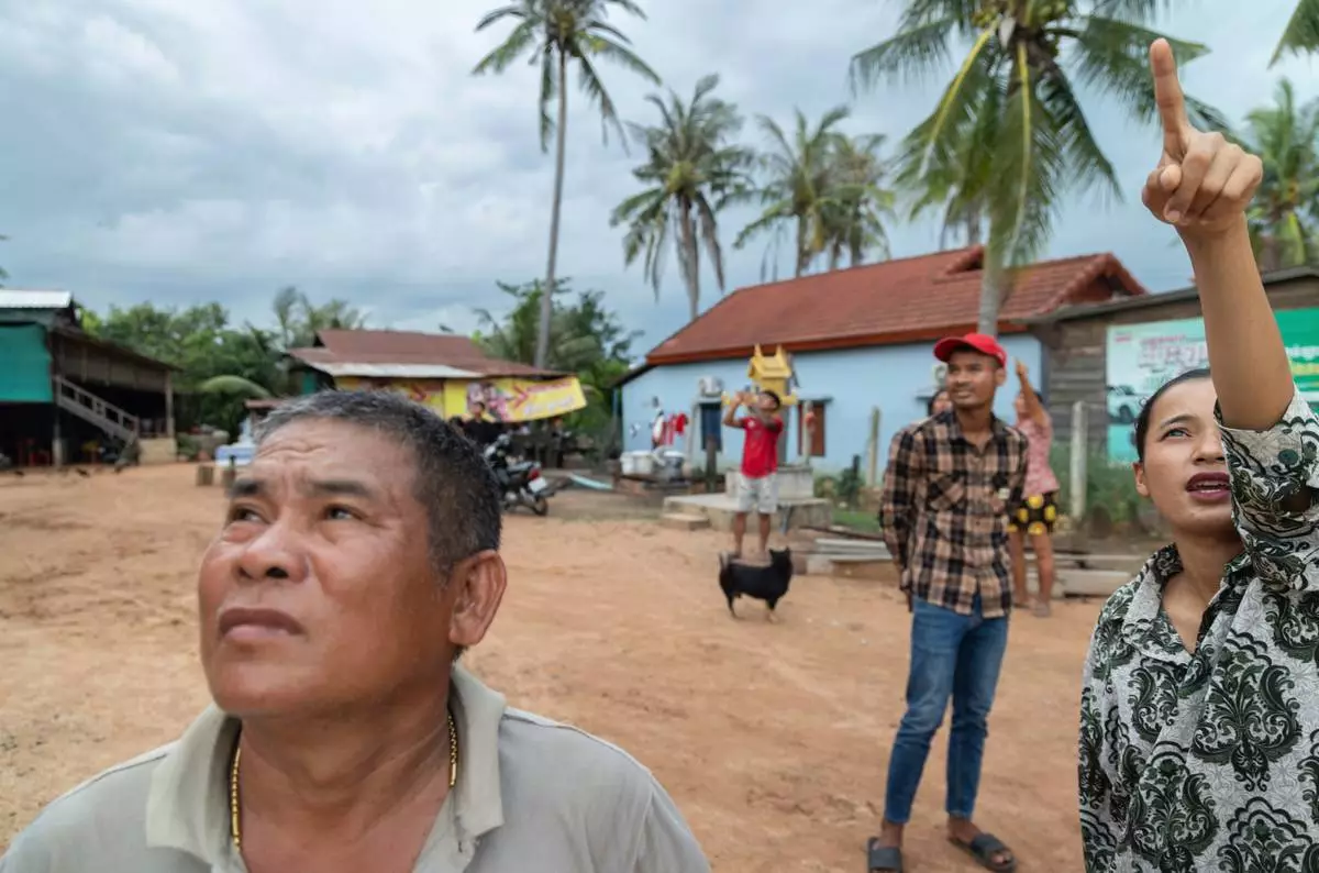 A resident of Samraong, the capital of Cambodia's Oddar Meanchey Province, points to where she sees an aircraft being fired at by Cambodian forces on Friday, July 25, 2025. (AP Photo/Anton L. Delgado)