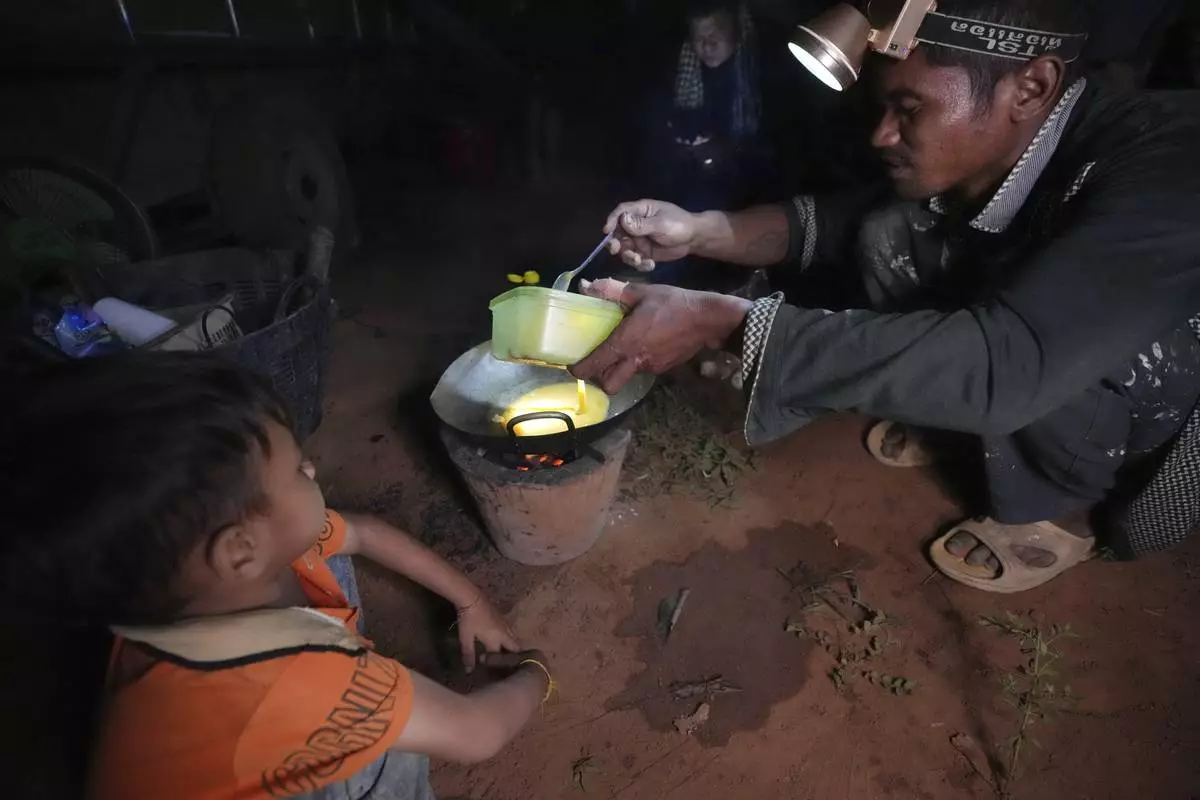 A Cambodian fries duck eggs at the Batploa primary school where he and others have taken refuge, in the Oddar Meanchey province, Cambodia, Thursday, July 24, 2025, as Thai and Cambodian soldiers clashed in several areas along their border in a major escalation of their conflict that left at several people dead, mostly civilians. (AP Photo/Heng Sinith)