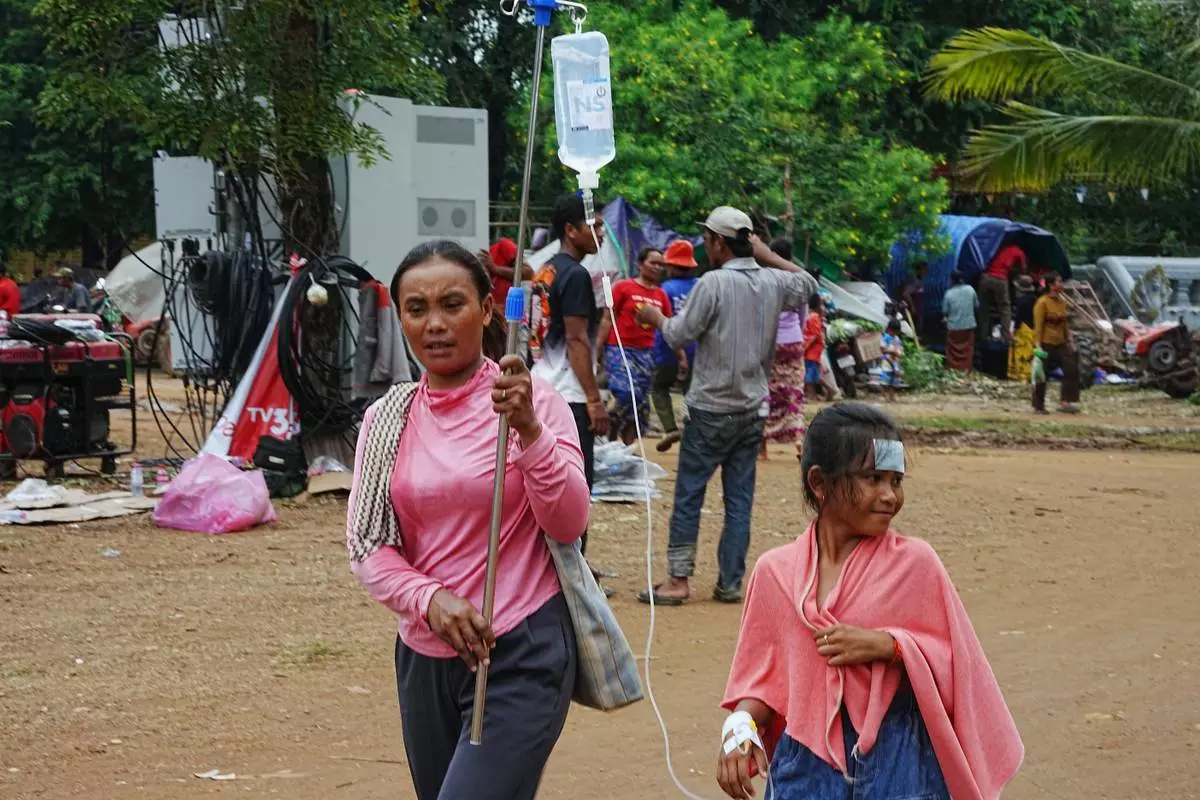 An evacuated child receives treatment helped by her mother in Wat Phnom Kamboar, Oddar Meanchey province, Cambodia, Sunday, July 27, 2025, as border fighting between Thailand and Cambodia entered its fourth day. (AP Photo/Heng Sinith)