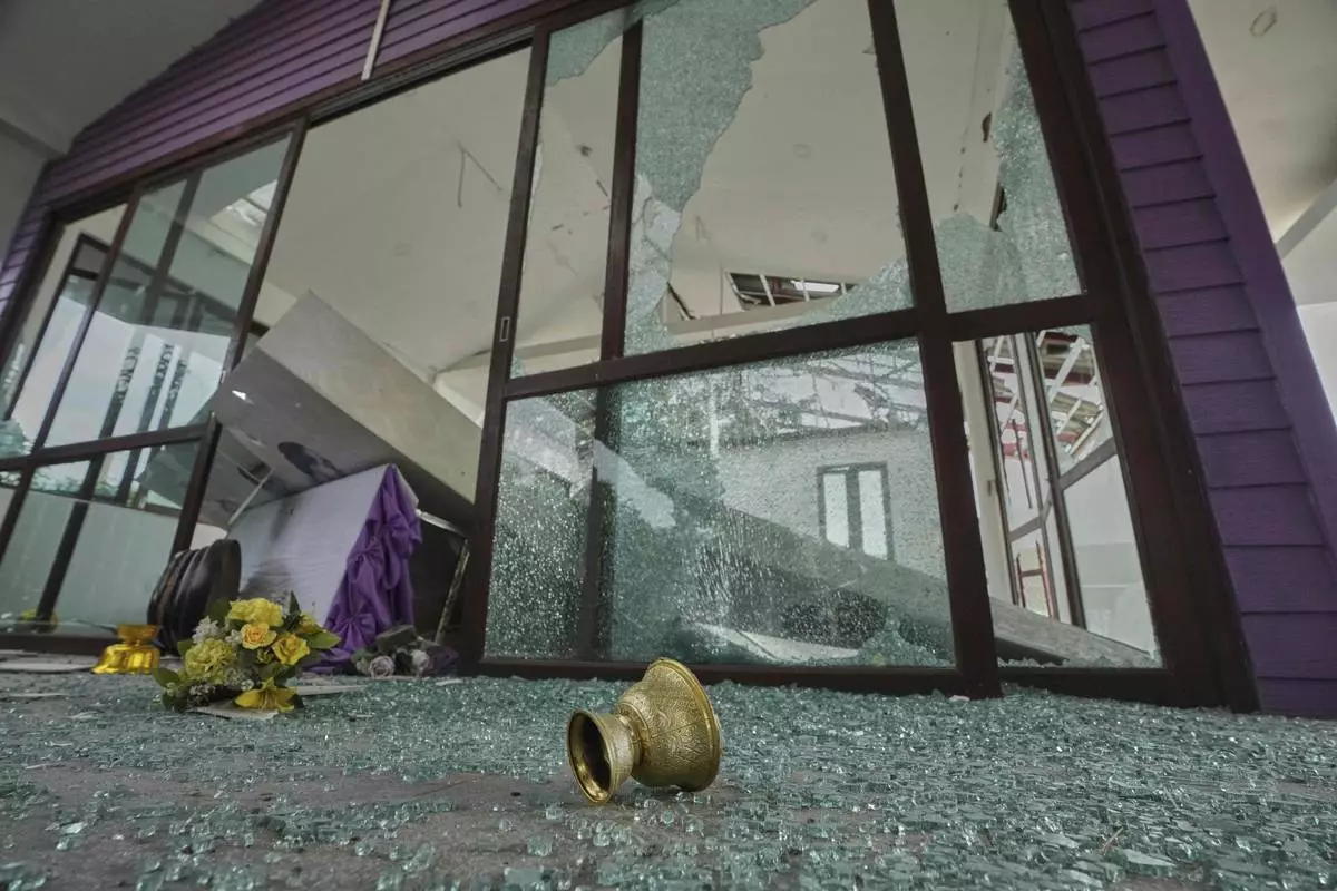 A door of Phanom Dong Rak hospital is damaged after Cambodia fired artillery shells in Surin Province, Thailand, Friday, July 25, 2025. (AP Photo/Sakchai Lalit)