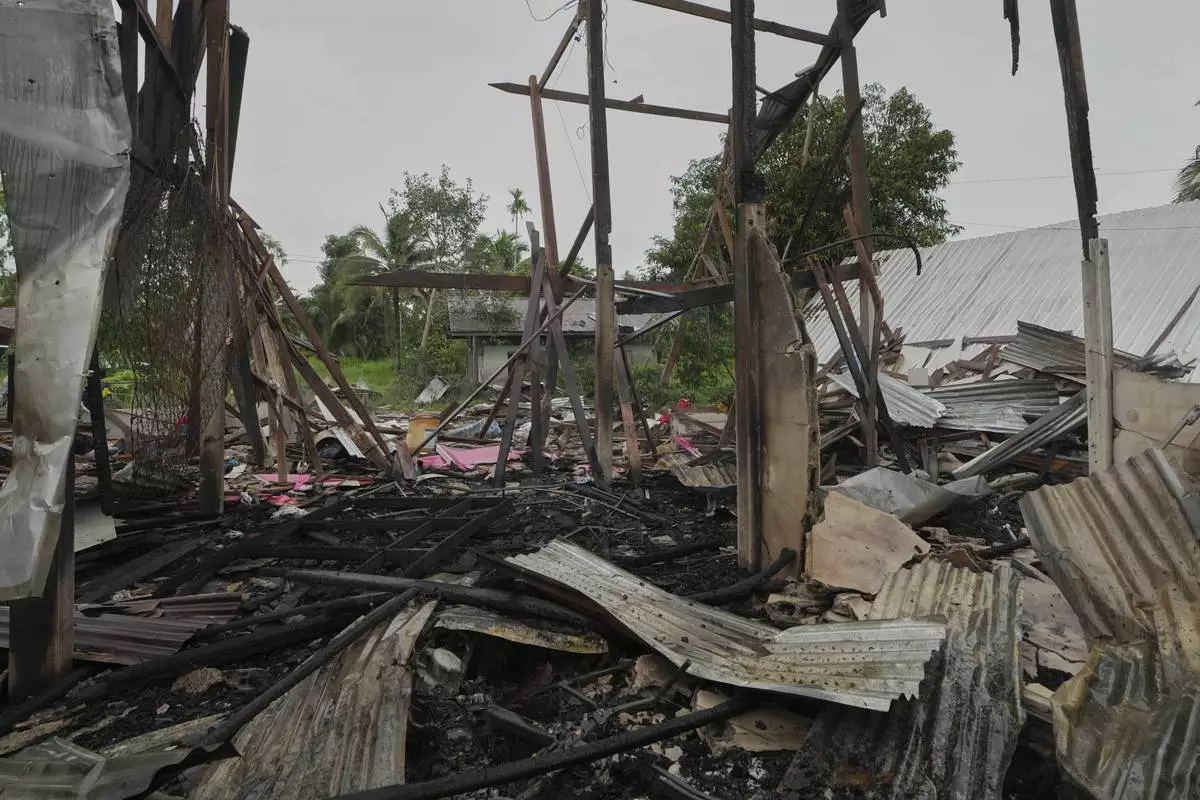 A house is seen damaged after Cambodia fired artillery shells in Surin Province, Thailand, Sunday, July 27, 2025. (AP Photo/Sakchai Lalit)