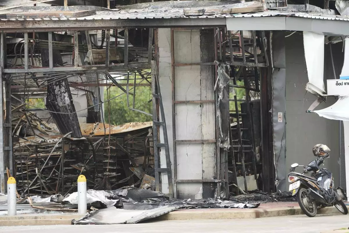 A convenience store at a gas station is damaged after Cambodia fired artillery shells in Sisaket province, Thailand, Friday, July 25, 2025. (AP Photo/Sakchai Lalit)