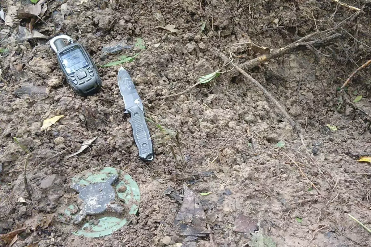 In this photo released by the Royal Thai Army, items litter the ground as Thai soldiers inspect a border area on Sunday, July 20, 2025, in Ubon Ratchathani province, where the Royal Thai Army said two anti-personnel landmines were found. (Royal Thai Army via AP)