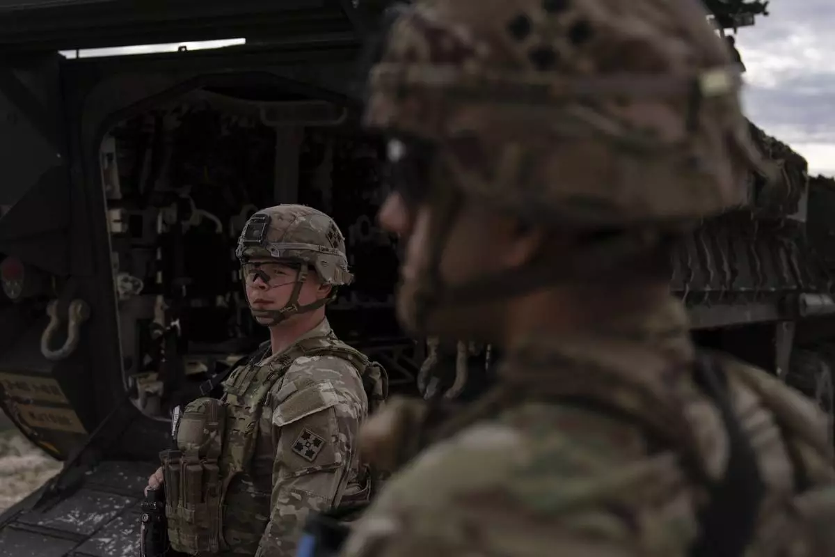 U.S. U.S. Army Spc. Jerimiah Starcher exits a Stryker combat vehicle after demonstrating the Long Range Advanced Scout Surveillance System in Nogales, Ariz., Tuesday, July 22, 2025. (AP Photo/Jae C. Hong)
