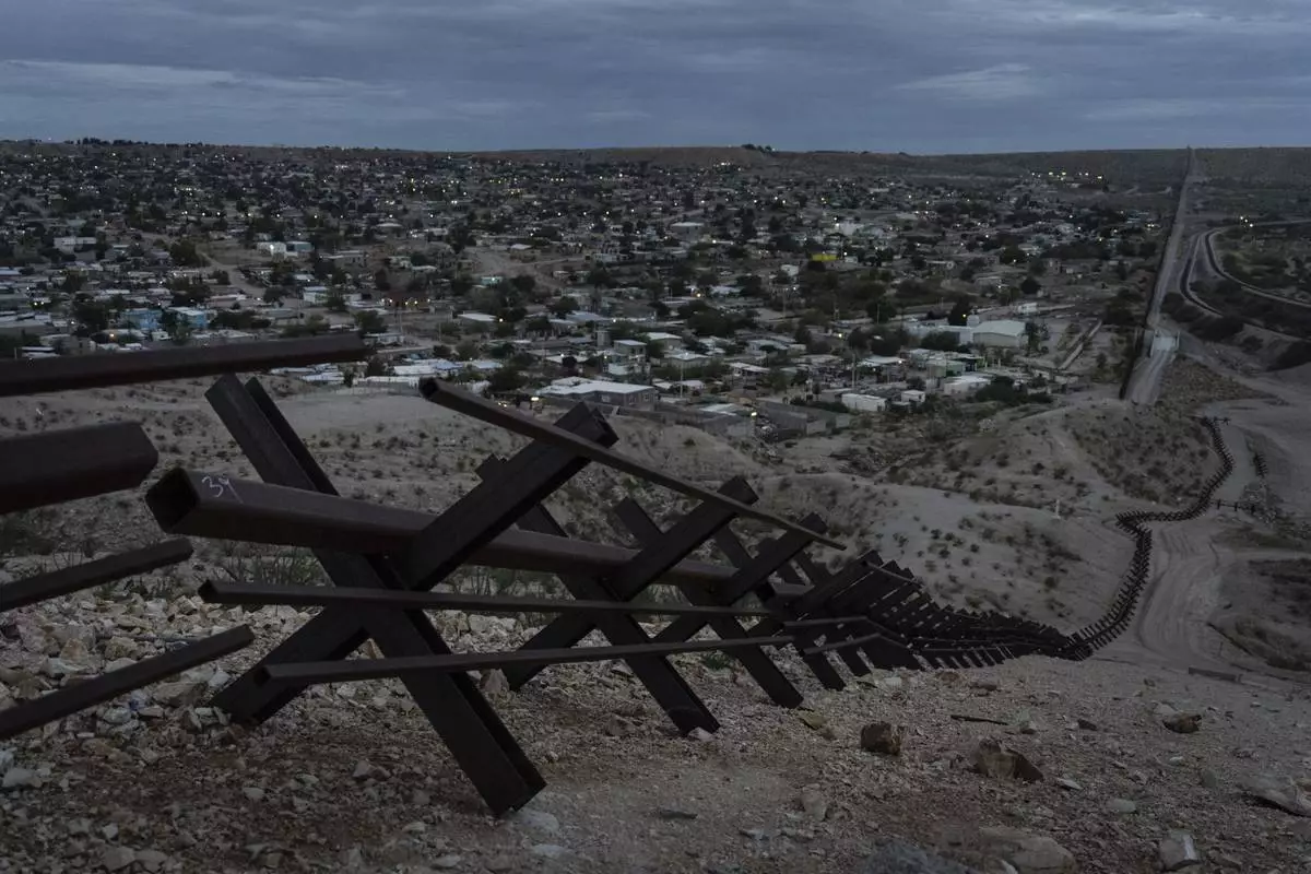Barriers form part of the U.S.-Mexico border fence as they run along mountainous terrain overlooking Mexico's Ciudad Juárez on Wednesday, July 23, 2025, in Sunland Park, N.M. (AP Photo/Jae C. Hong)