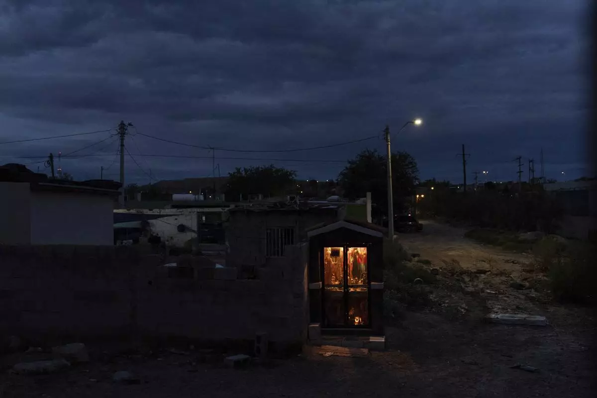 A cartel shrine in Mexico's Ciudad Juárez, symbolizing territorial control, is visible through the U.S.-Mexico border fence from Sunland Park, N.M., Wednesday, July 23, 2025. (AP Photo/Jae C. Hong)