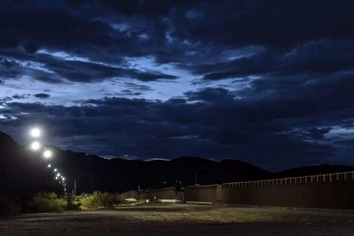 A section of the U.S.-Mexico border fence is illuminated by lights at dawn on Wednesday, July 23, 2025, in Sunland Park, N.M. (AP Photo/Jae C. Hong)