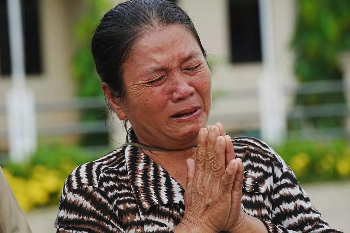 A local villager weeps as she donates her personal belongings for the frontline army force at a sidewalk in Srey Snam district in Siem Reap province, Cambodia, Saturday, July 26, 2025. (AP Photo/Heng Sinith)