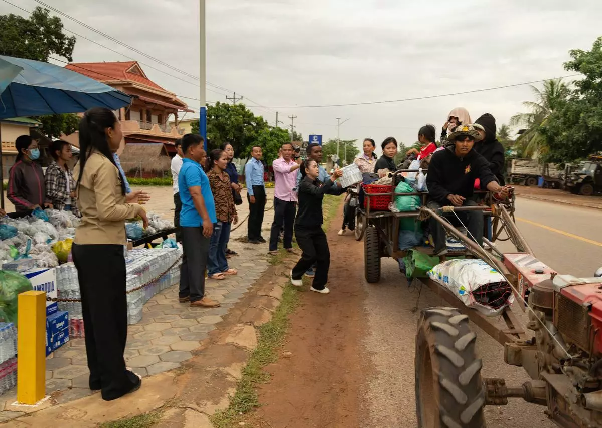 A tractor of refugees recieve donated supplies from the Srel Snam District Office as they flee the ongoing border conflict between Thailand and Cambodia in Oddar Meanchey Province, Cambodia on Saturday, July 26, 2025. (AP Photo/Anton L. Delgado)