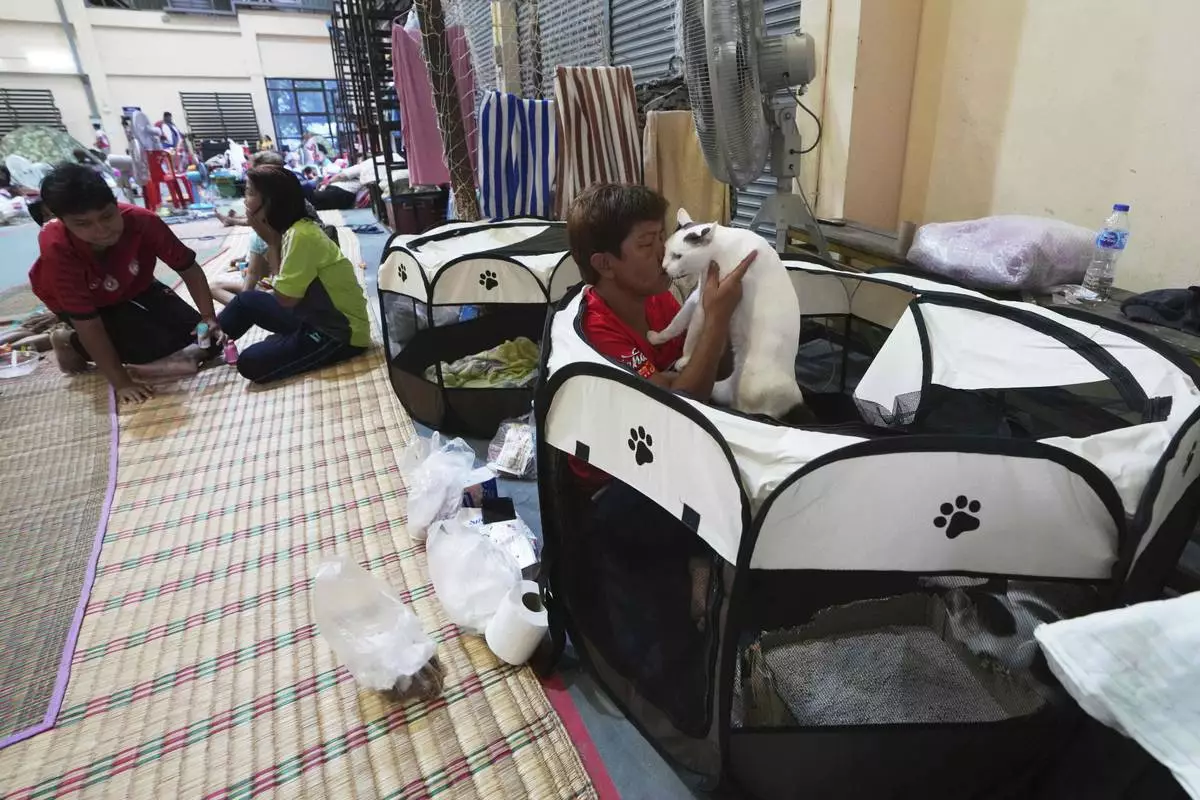 Pornpan Sooksai holds her cat named Kung Fu as residents who fled homes following clashes between Thai and Cambodian soldiers rest at an evacuation center in Surin province, Thailand, Friday, July 25, 2025. (AP Photo/Sakchai Lalit)