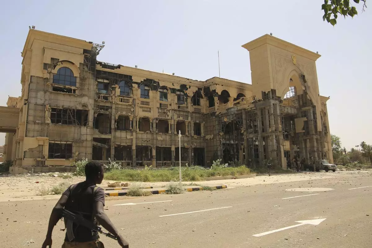 FILE - An army soldier walks in front of the Republican Palace in Khartoum, Sudan, after it was taken over by Sudan's army, March 21, 2025. (AP Photo, file)