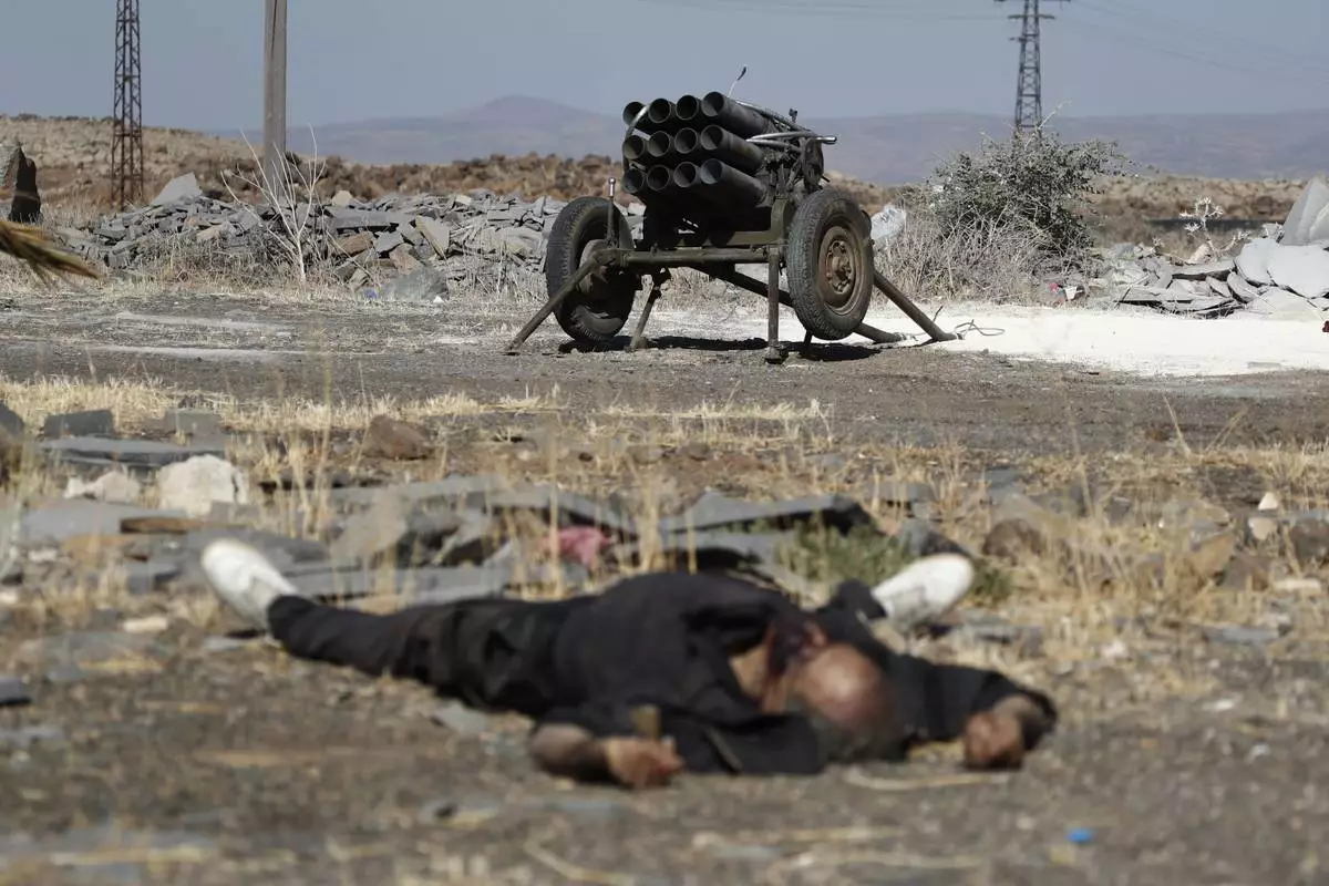FILE - A dead fighter of the Druze militias lies on the ground in front of a rocket launcher on the outskirts of Sweida city, where clashes erupted between Sunni Bedouin clans and Druze militias, in southern Syria, Monday, July 14, 2025. (AP Photo/Omar Sanadiki, File)