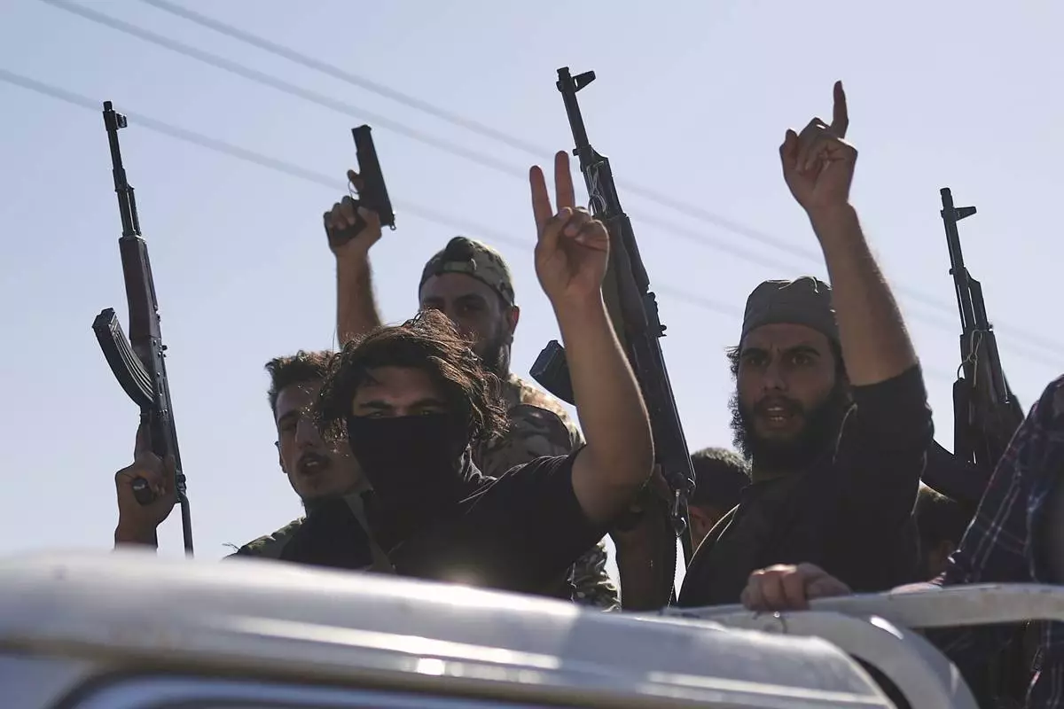 FILE - Bedouin fighters stand on a pickup truck as they arrive at al-Dour village on the outskirts of Sweida city, during clashes between the Bedouin clans and Druze militias, southern Syria, Friday, July 18, 2025. (AP Photo/Ghaith Alsayed, File)