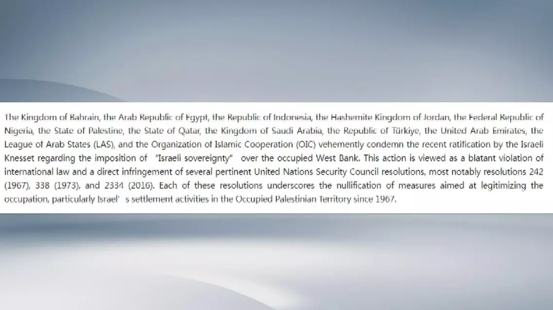 The AL, OIC, as well as Bahrain, Egypt, Indonesia, Jordan, Nigeria, Palestine, Qatar, Saudi Arabia, Türkiye, and the United Arab Emirates reaffirmed that Israel has no sovereignty over the occupied Palestinian territory, according to the statement.