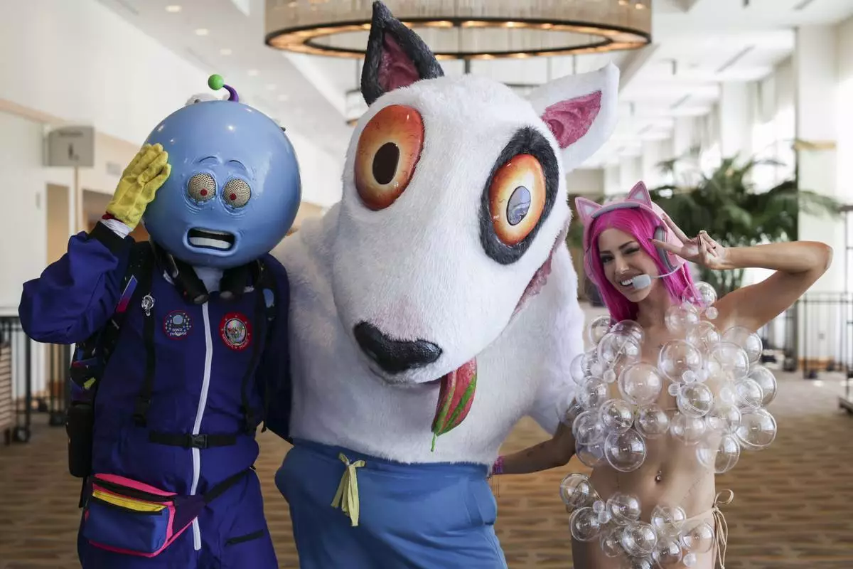 Diana, from left, Kal Smith, and Melissa Ann from San Diego, Calif. pose during preview night for Comic-Con International on Wednesday, July 23, 2025, in San Diego. (Photo by Andrew Park/Invision/AP)