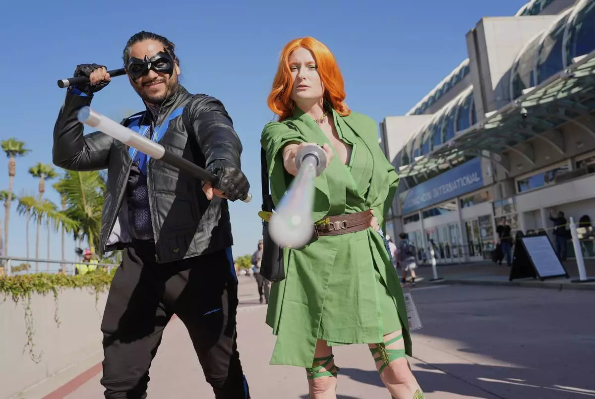Ivan Martinez, left, dressed as "Nightwing," and Jade Stone, dressed as "Poison Ivy Jedi," pose for a photo before the 2025 Comic-Con International Preview Night on Wednesday, July 23, 2025, in San Diego. (AP Photo/Chris Pizzello)