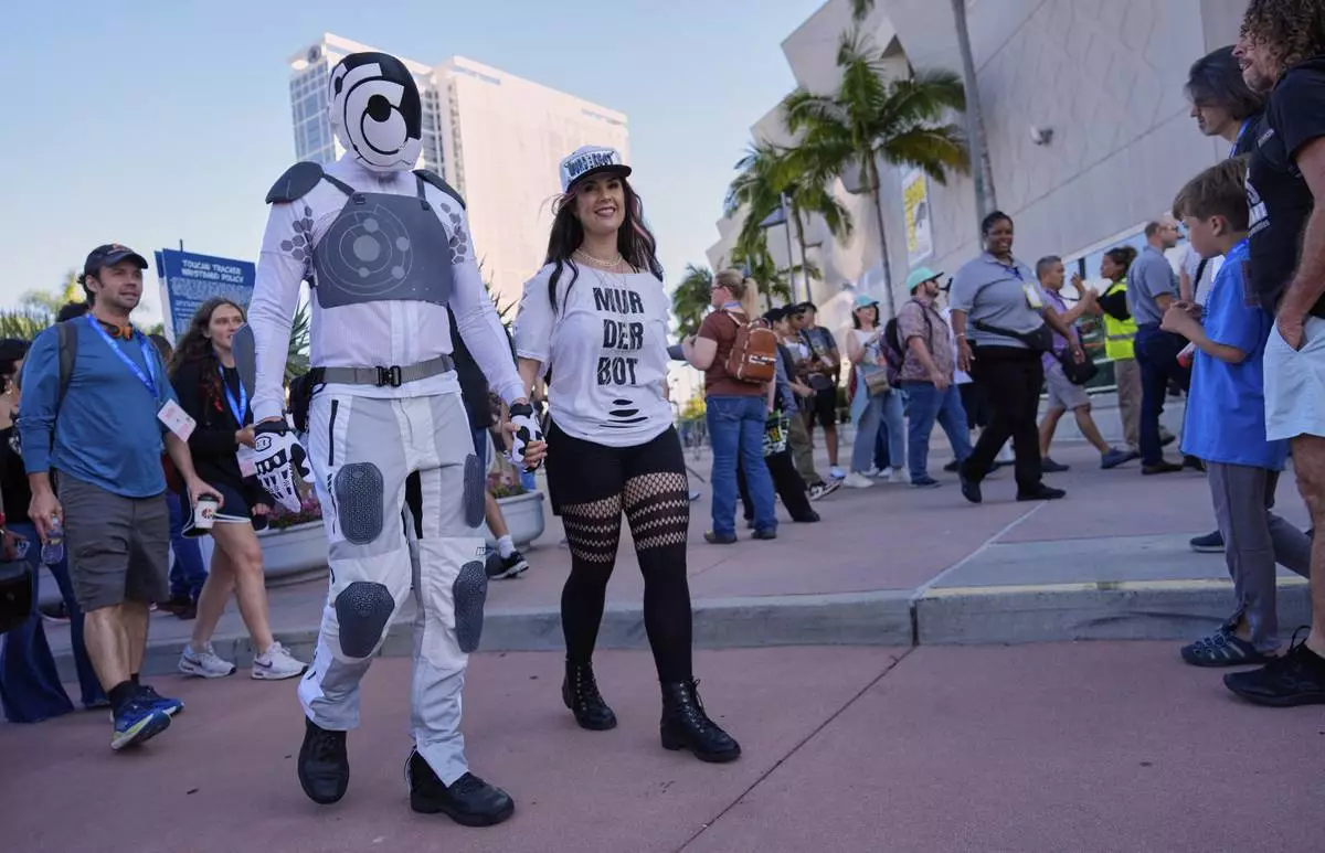 Chris Lane, left, and his wife Shannon, wearing costumes inspired by the Apple TV+ series "Murderbot," walk through the crowd before the 2025 Comic-Con International Preview Night on Wednesday, July 23, 2025, in San Diego. (AP Photo/Chris Pizzello)