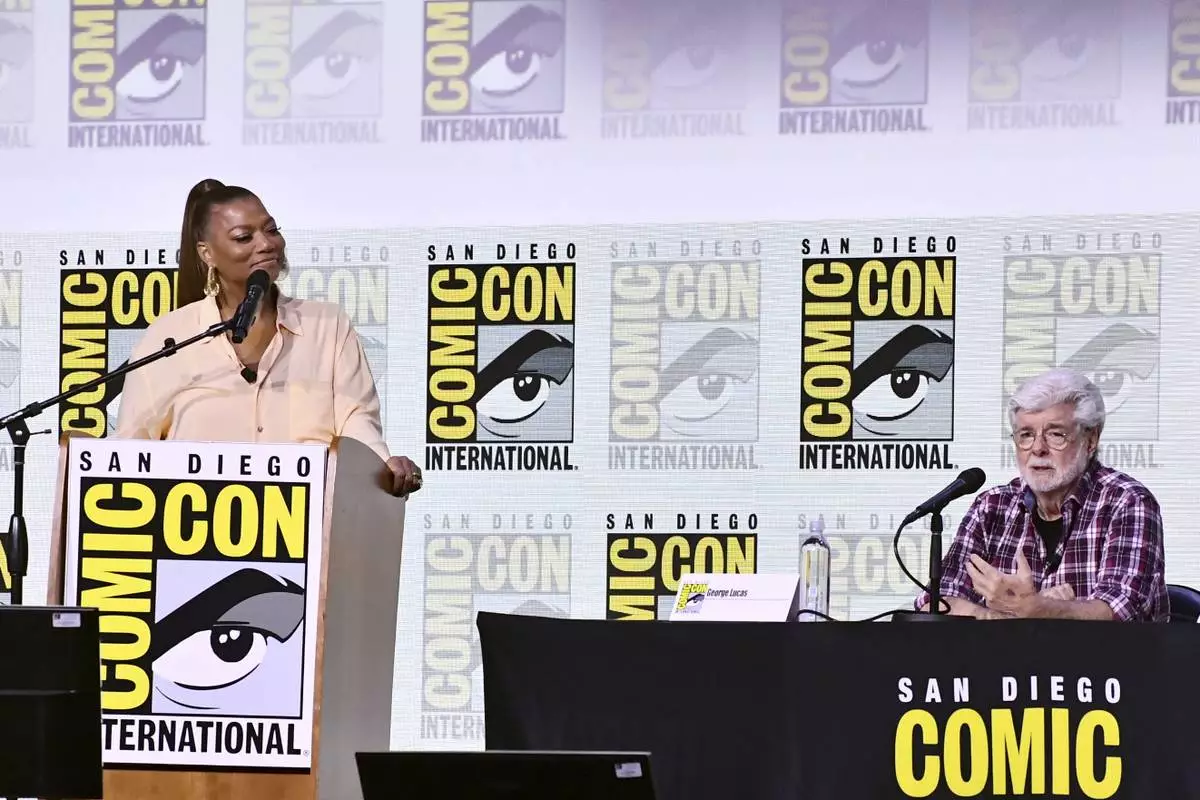 Queen Latifah, left, and George Lucas attend a panel for the Lucas Museum of Narrative Art during Comic-Con International on Sunday, July 27, 2025, in San Diego. (Photo by Richard Shotwell/Invision/AP)