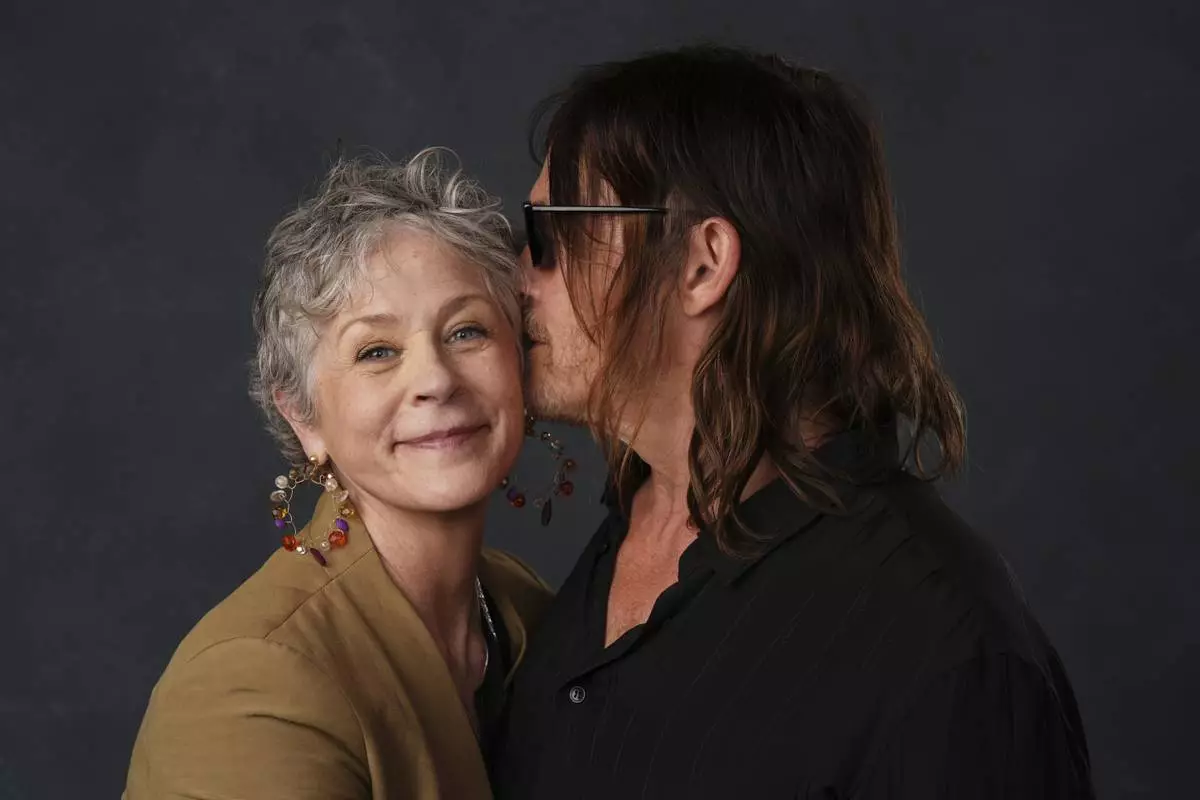 Melissa McBride, left, and Norman Reedus pose for a portrait to promote "The Walking Dead: Daryl Dixon" during Comic-Con International on Friday, July 25, 2025, in San Diego. (AP Photo/Chris Pizzello)