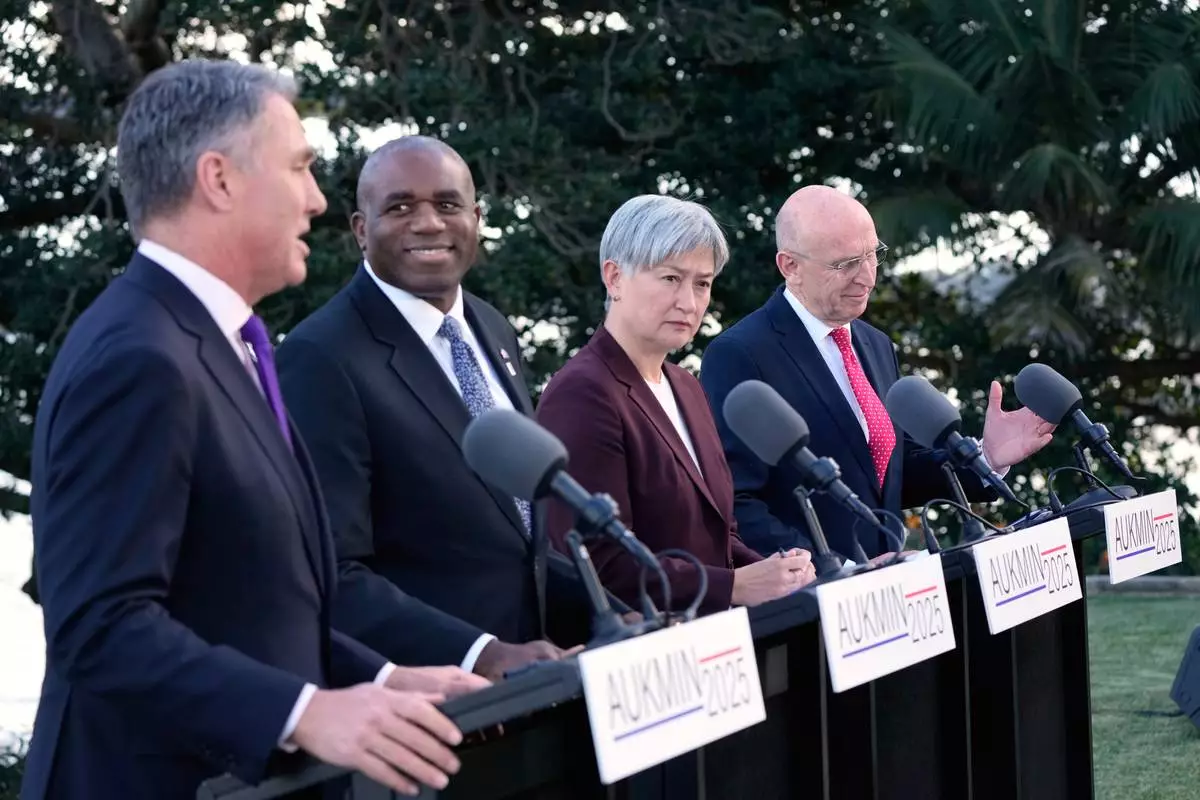 Australian Deputy Prime Minister Richard Marles, left, Britain's Foreign Secretary, Commonwealth and Development Affairs David Lammy, second left, Australian Foreign Minister Penny Wong and Britain's Defense Secretary John Healey, right, hold a press conference at Admiralty House following the Australia-UK Ministerial Consultations (AUKMIN) in Sydney, Australia, Friday, July 25, 2025. (AP Photo/Rick Rycroft)