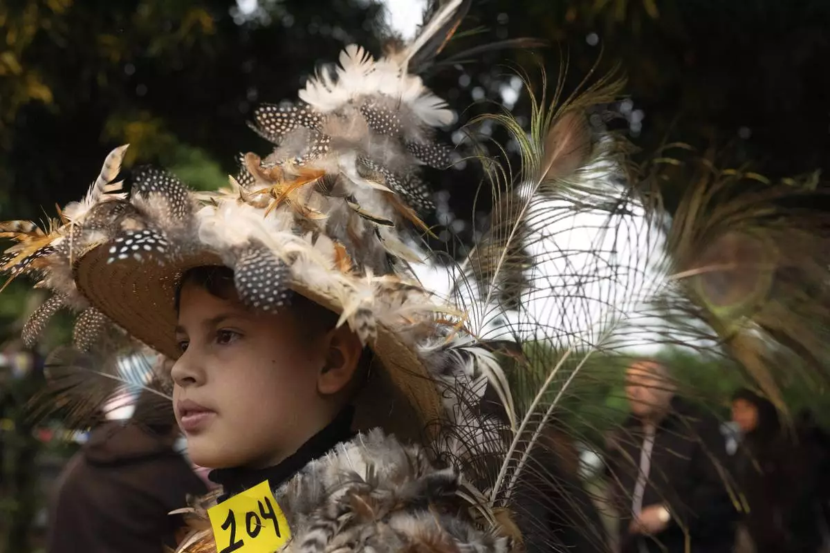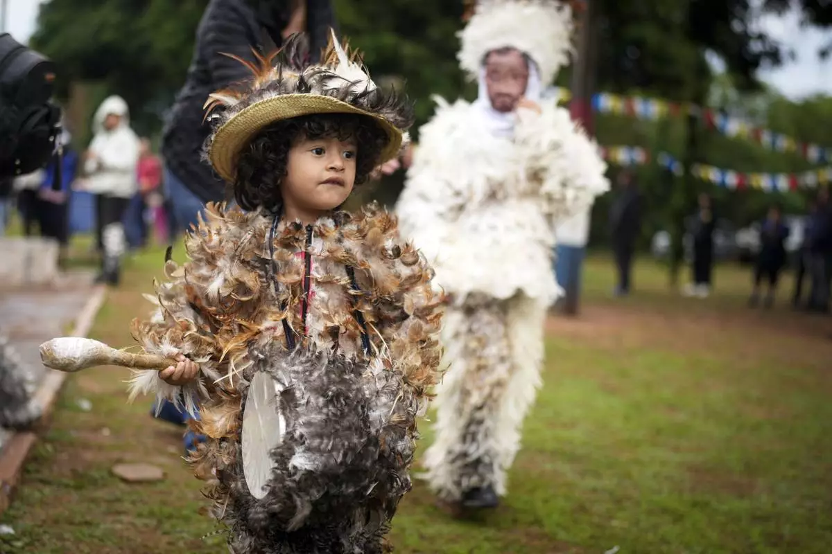A child dressed in a feather costume plays a drum after attending a Mass celebrating Saint Francisco Solano, in Emboscada, Paraguay, Thursday, July 24, 2025. Hundreds of Catholic parishioners in Paraguay don bird-like costumes and parade down the streets to honor the 16th century saint said to possess miraculous powers. (AP Photo/Jorge Saenz)