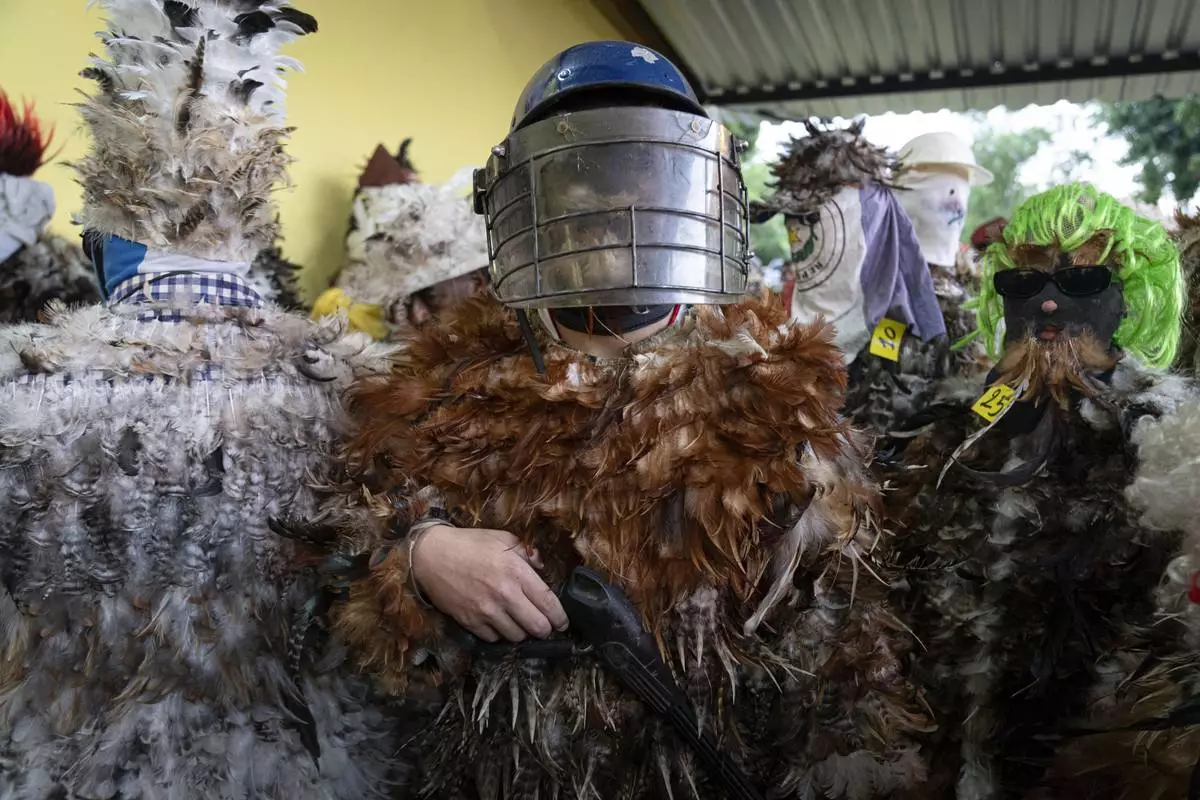 A parishioner dressed in a feather costume and a riot police mask poses for a photo during a Mass celebrating Saint Francisco Solano, in Emboscada, Paraguay, Thursday, July 24, 2025. Hundreds of Catholic parishioners in Paraguay don bird-like costumes and parade down the streets to honor the 16th century saint said to possess miraculous powers. (AP Photo/Jorge Saenz)