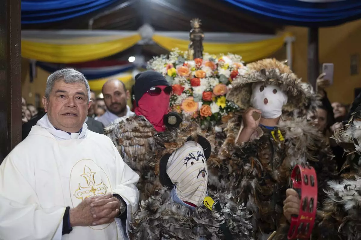 Priest Modesto Martinez joins in a procession after leading a Mass celebrating Saint Francisco Solano, in Emboscada, Paraguay, Thursday, July 24, 2025. Hundreds of Catholic parishioners in Paraguay don bird-like costumes and parade down the streets to honor the 16th century saint said to possess miraculous powers. (AP Photo/Jorge Saenz)