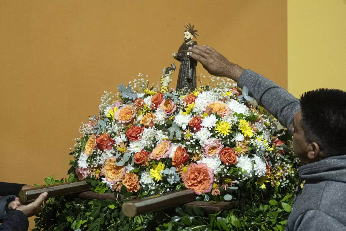 A man touches a statue of San Francisco Solano after attending a Mass celebrating Saint Francisco Solano, in Emboscada, Paraguay, Thursday, July 24, 2025. Hundreds of Catholic parishioners in Paraguay don bird-like costumes and parade down the streets to honor the 16th century saint said to possess miraculous powers. (AP Photo/Jorge Saenz)