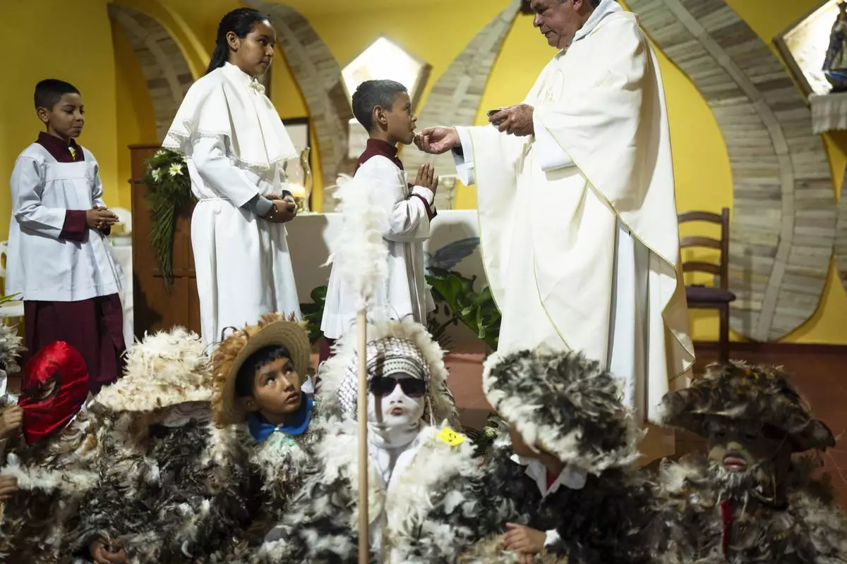 An altar server receives communion during a Mass celebrating Saint Francisco Solano, in Emboscada, Paraguay, Thursday, July 24, 2025. Hundreds of Catholic parishioners in Paraguay don bird-like costumes and parade down the streets to honor the 16th century saint said to possess miraculous powers. (AP Photo/Jorge Saenz)