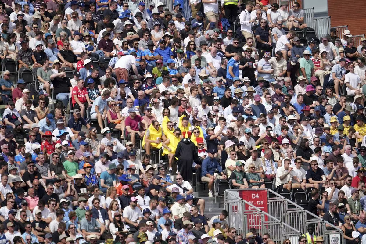 Fans watch the third day of the fourth cricket test match between England and India at Emirates Old Trafford, Manchester, England, Friday, July 25, 2025. (AP Photo/Jon Super)