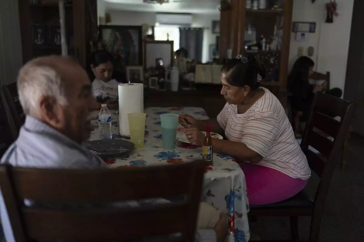 Ricarda Toledo eats her late lunch next to her husband, Agustin, at their mobile home in Oasis, Calif., Wednesday, Oct. 30, 2024. (AP Photo/Jae C. Hong)