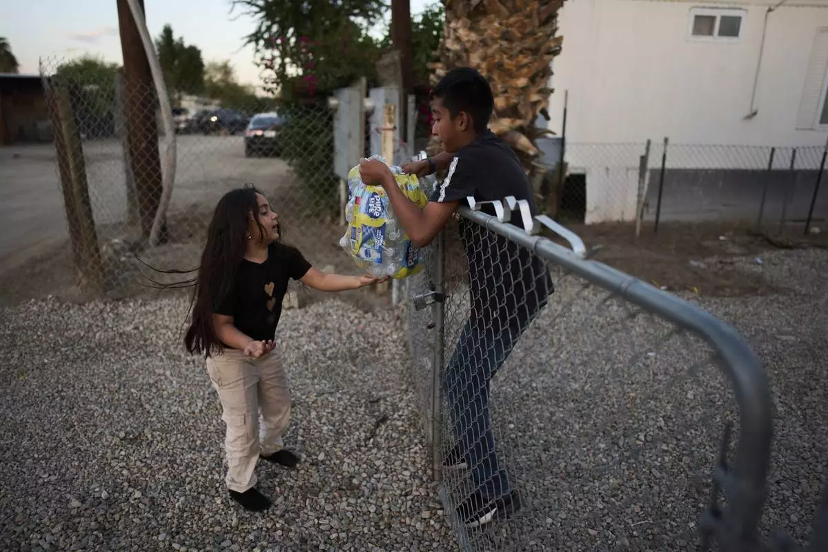 Gustavo Chavez, right, helps deliver bottled water donated to mobile home residents with his niece in Oasis, Calif., Monday, April 14, 2025. (AP Photo/Jae C. Hong)
