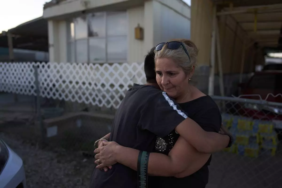 Erika Sarabia is hugged by her son, Gustavo Chavez, outside their mobile home during a meeting with community outreach program coordinators in Oasis, Calif., Monday, April 14, 2025. (AP Photo/Jae C. Hong)